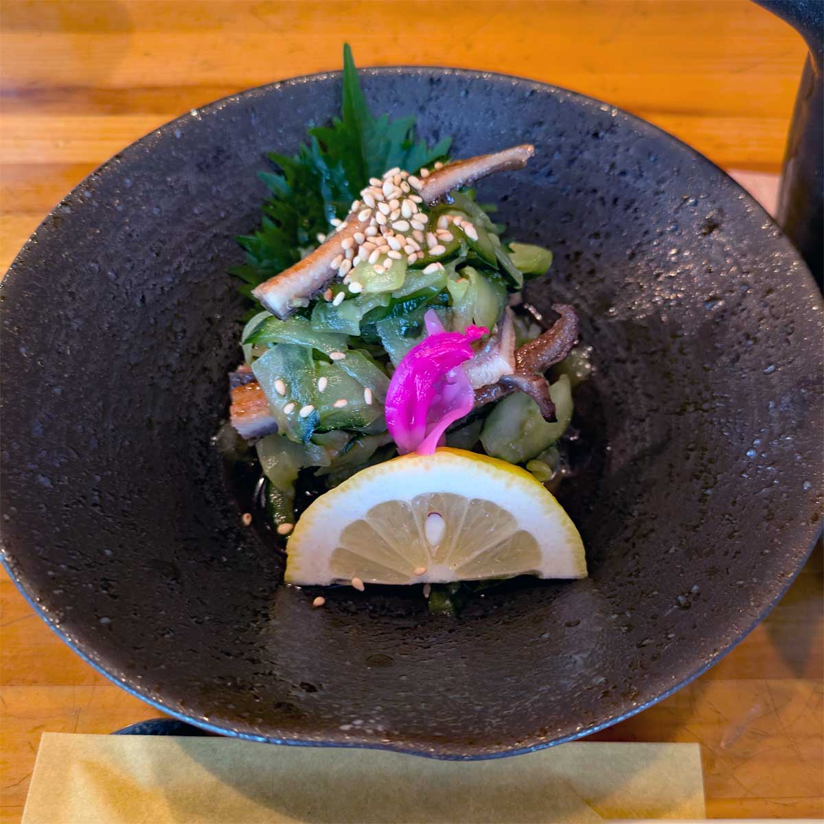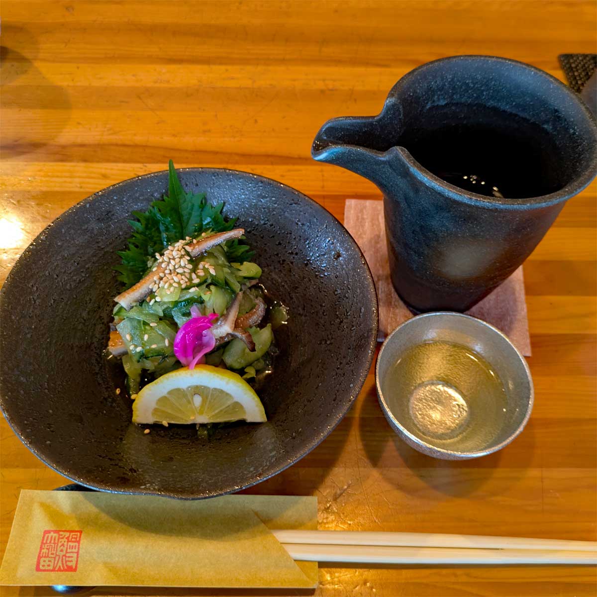 注文は、うざくと弘前の銘酒豊盃の特別純米酒。豊杯はメジャーでありながらも取扱店が限られている隠れ銘酒。飲みやすくてふくよかな米の甘みが口の中に広がる。対峙するうざくは、縦に細長く切られた鰻に山盛りのきゅうり。個性的だ。きゅうりのシャキシャキ感に土佐酢の甘さが染み渡り、豊盃の甘さと見事にシンクロ。