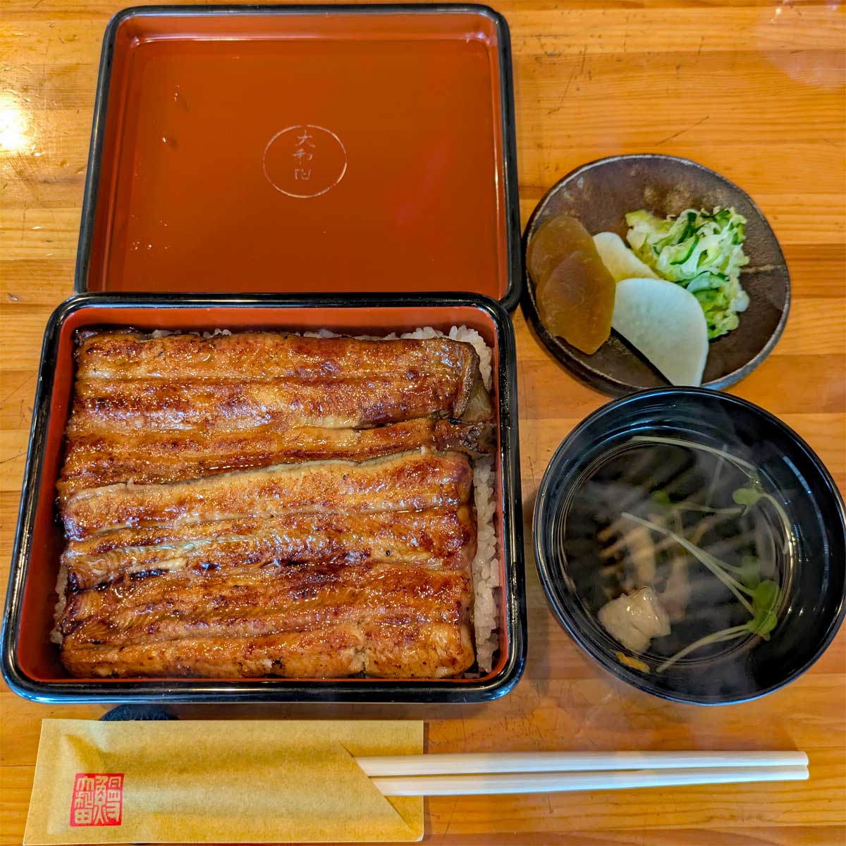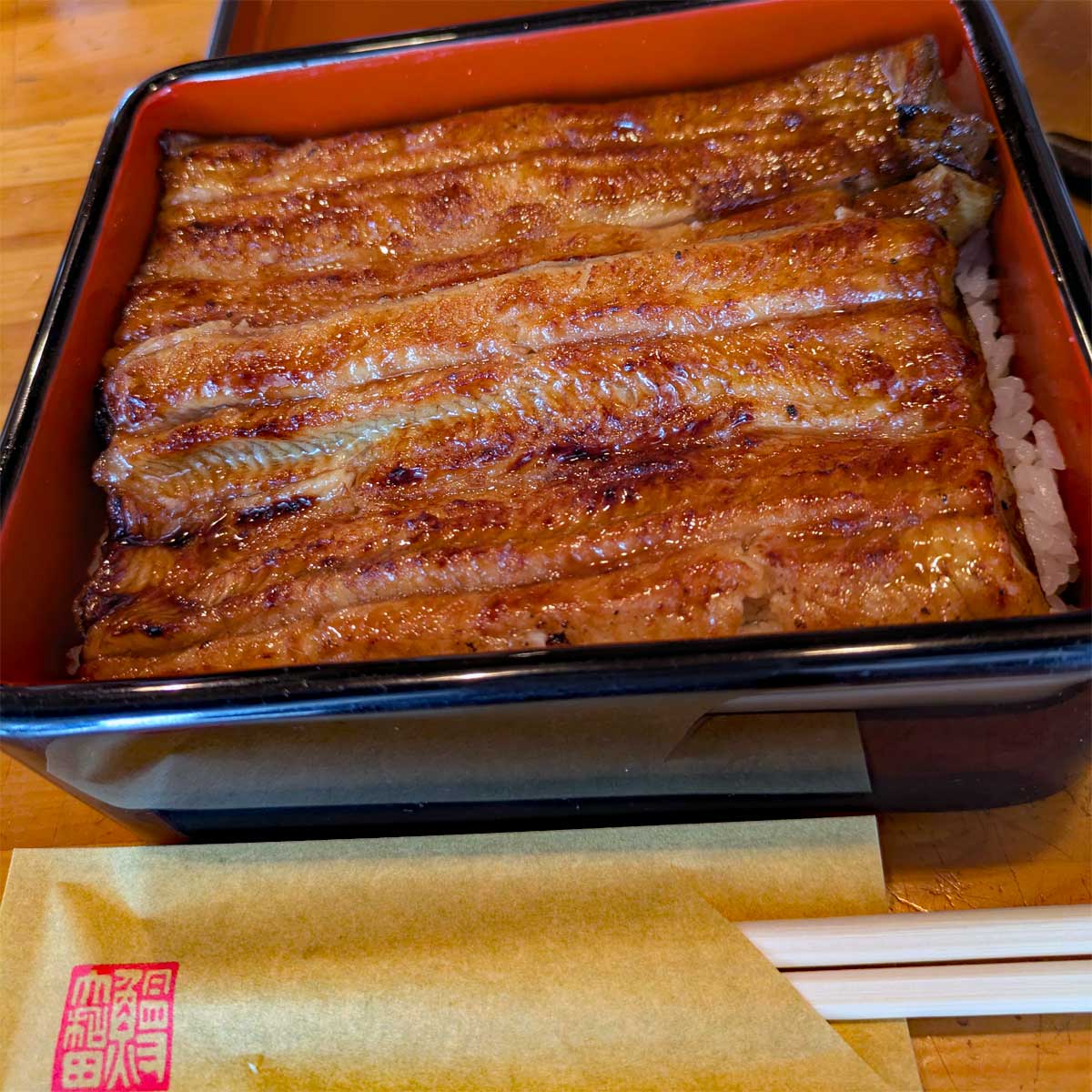 そして20分ほどで真打登場、大串鰻重(4000円)。蓋を開けると、お重に敷き詰められた坂東太郎、そしてその香ばしさに思わず鼻が寄る。